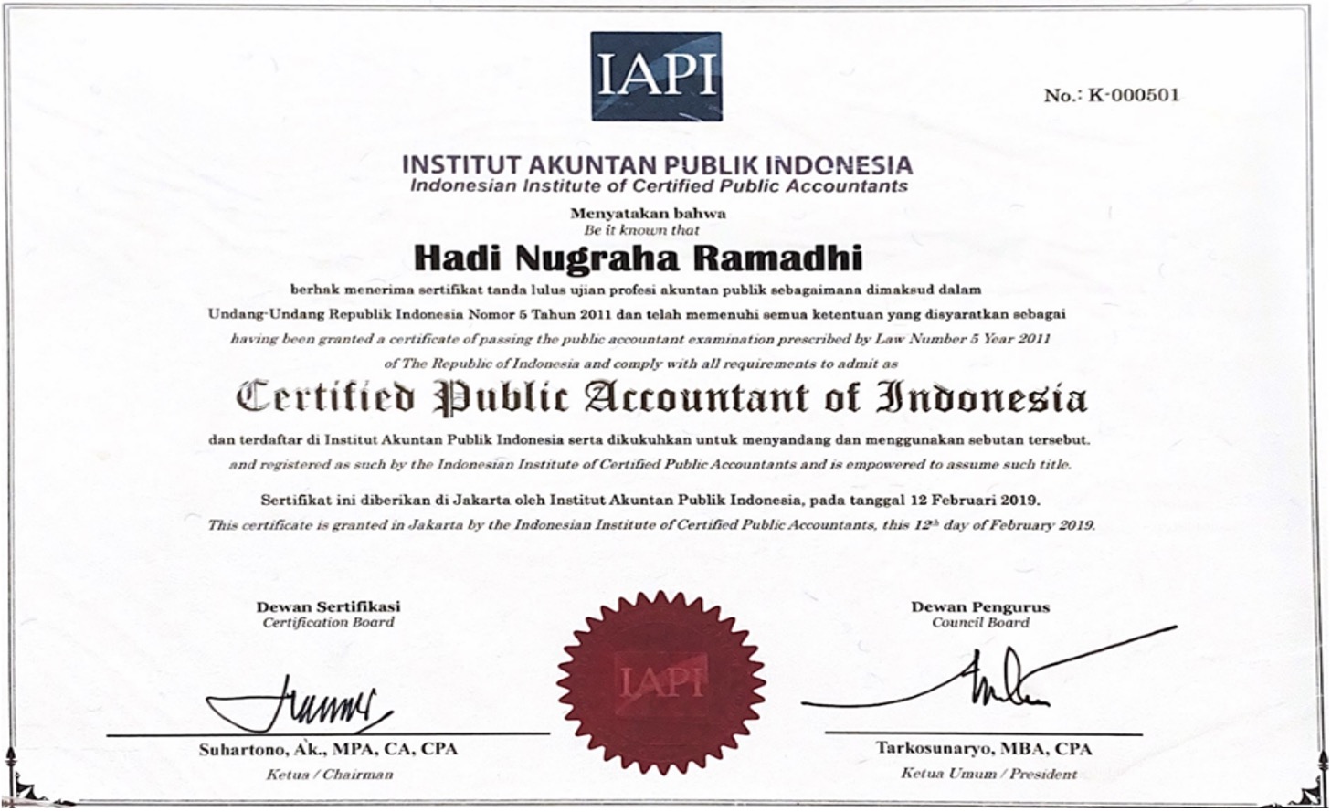 He hold certified tax consultant level C (Highest level tax consultant certification in Indonesia). Dedicated more than 20 years of experience developing & implementing financial systems, budgeting, cost controlling, accounting, auditing as well as tax expert in the finding of tax case solution, work experiences in various multinational companies (MNC), such as PT. SKF Indonesia ( Join Venture AB SKF Sweden and Astra Otopart), PT Takeda Indonesia, and also numerous corporation in the national companies.